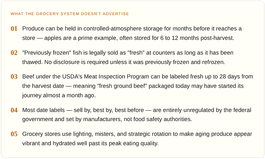Beef can be sold as fresh for up to 28 days from the slaughter date. "Fresh" chicken can legally sit in cold storage for weeks before being packaged. Fish labeled "fresh" at the counter may have been previously frozen, thawed, and put on display — a practice that is completely legal and shockingly common.