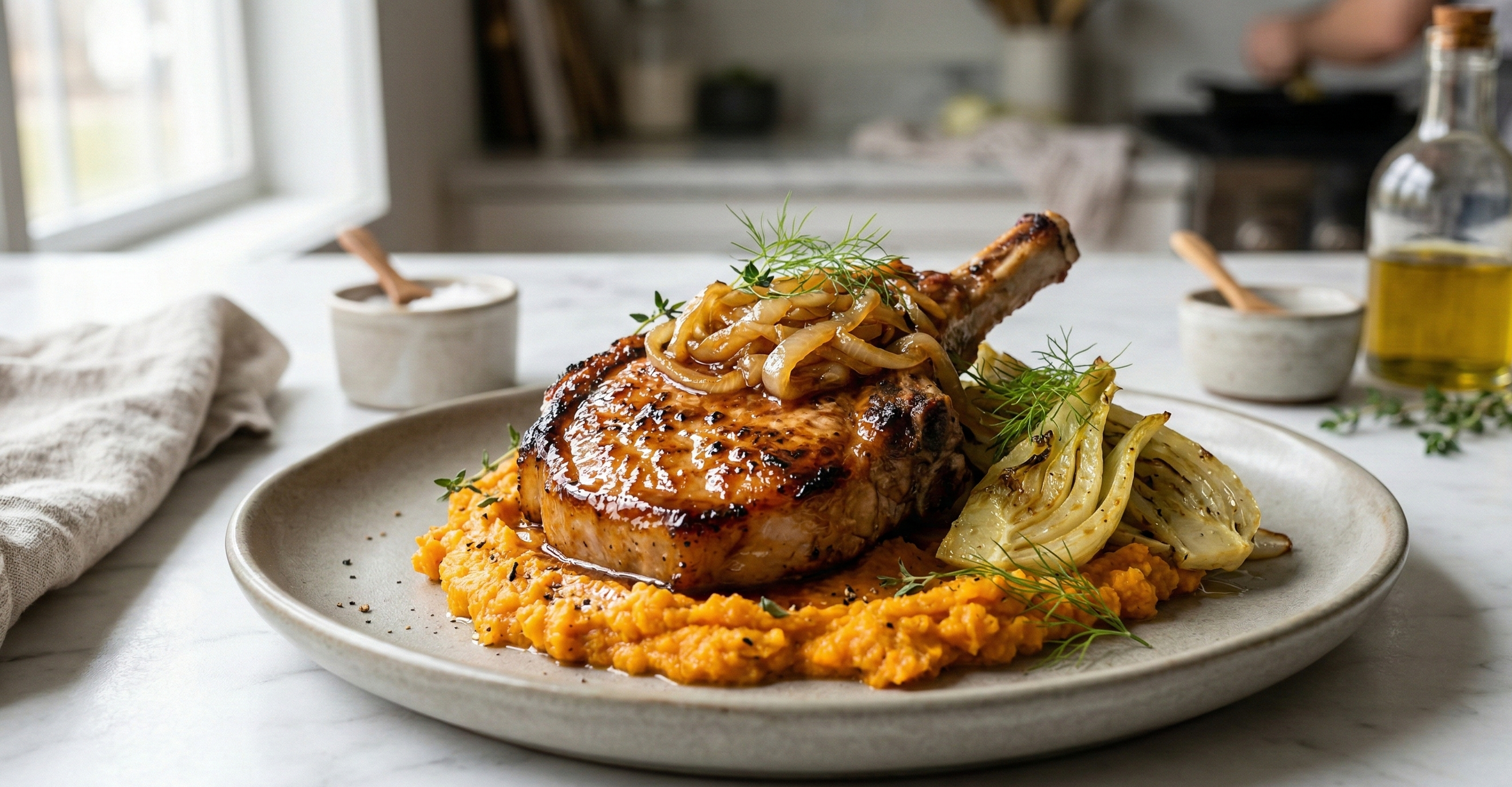 This dish is built on controlled contrast. The carrot mash delivers soft sweetness and earthy warmth. The honey glaze creates a glossy, lightly sticky finish that clings to the pork. Worcestershire adds depth and subtle tang, preventing the sweetness from becoming dominant. Caramelized onions contribute deep, almost jam-like richness, while fennel introduces a gentle aromatic lift that keeps the entire plate balanced and refined.